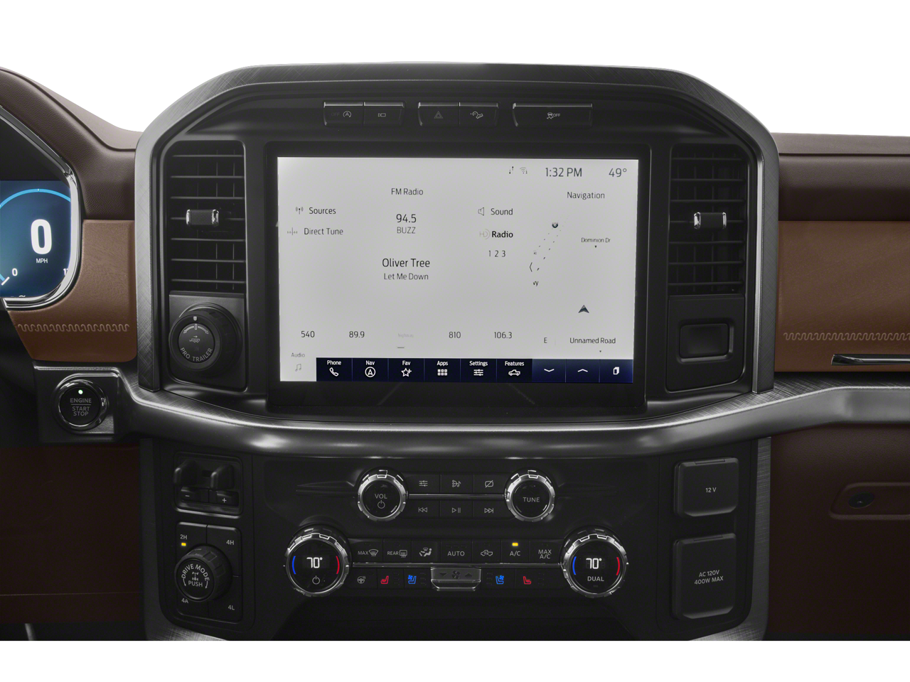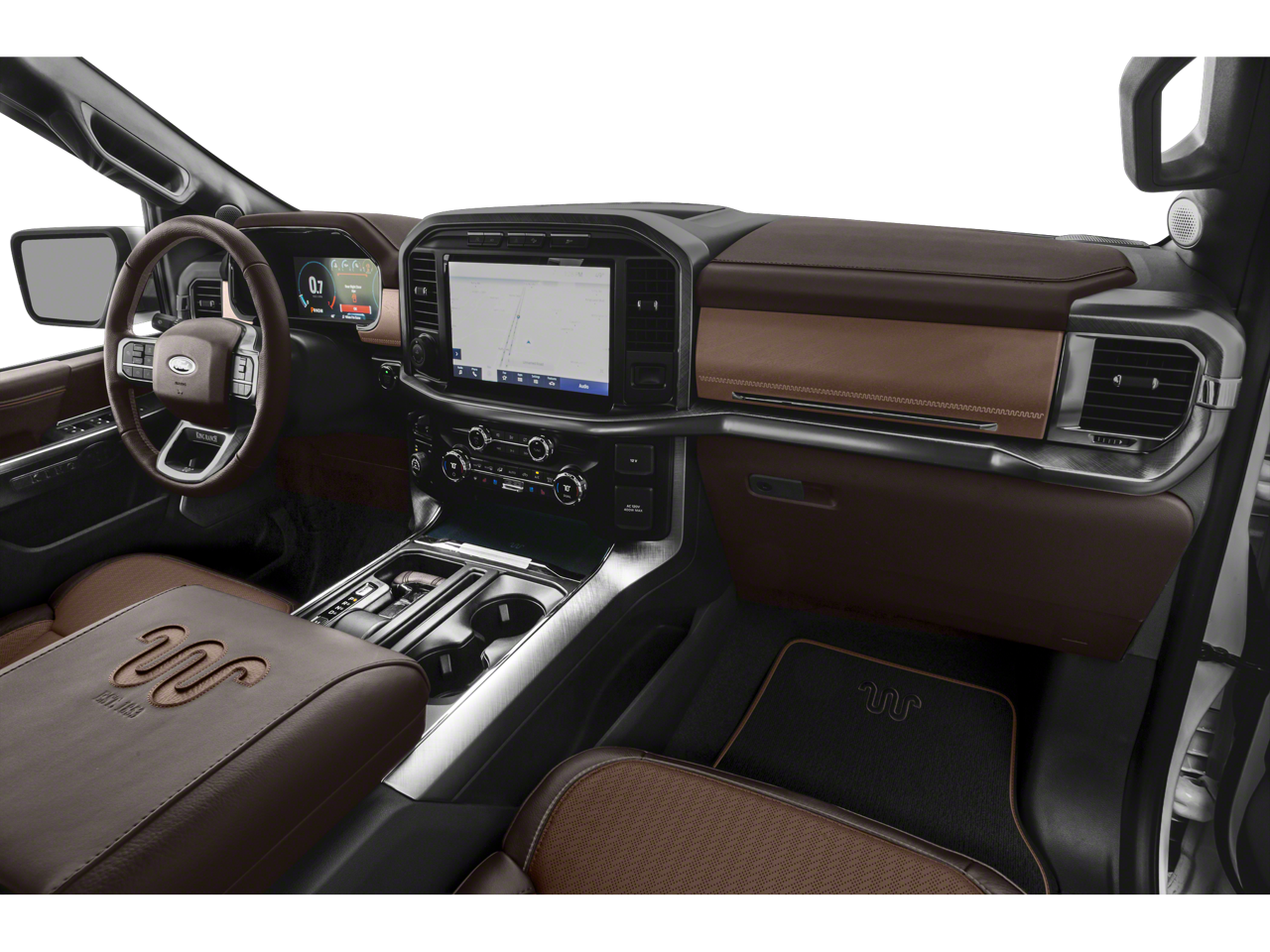 EQUIPMENT GROUP 601A HIGH Radio: B&O Unleashed Sound System by Bang & Olufsen, HD Radio and 18 speakers including subwoofer, Power-Deployable Running Boards, Replaces step bar, Bed Utility Package, BoxLink, 4 premium locking cleats, LED Box Lighting, Tailgate Step w/Tailgate Work Surface, Power Tailgate, Multi-Contour Driver & Passenger Seats, Active Motion, ENGINE: 3.5L POWERBOOST FULL-HYBRID V6 Electronic Locking w/3.73 Axle Ratio, KING RANCH CHROME APPEARANCE PACKAGE 2 chrome front tow hooks and tailgate applique, Chrome Door Handles w/Body-Color Strap, Front & Rear Chrome Bumpers, Bright Belt Moldings, Tires: 275/60R20 BSW Automatic Transmission, Wheels: 20 Chrome-Like PVD, King Ranch wheel ornament, Chrome Skull Caps on Exterior Mirrors, TWIN PANEL MOONROOF. Ford King Ranch with Stone Gray exterior and Java interior features a V6 Cylinder Engine with 400 HP at 6000 RPM*.